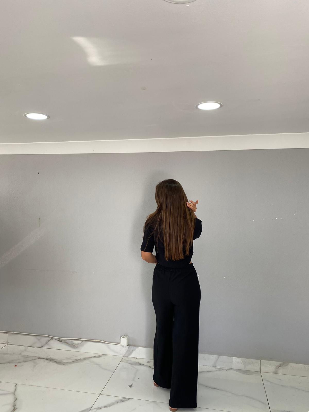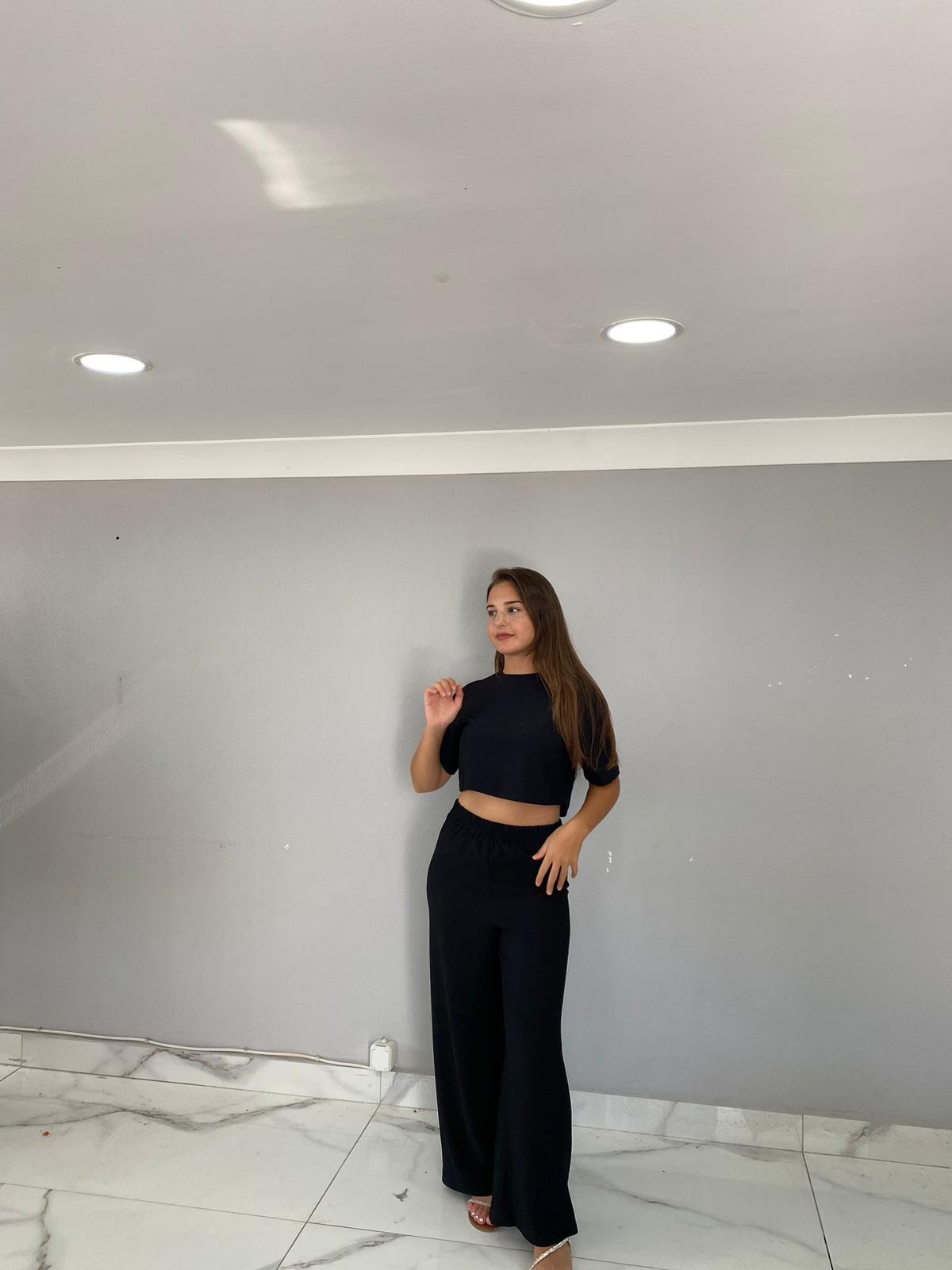 Rahat kalıp Crop ve bol paça pantolondan oluşan ikili takım günlük kullanım için ideal tarz ve şık bir üründür.